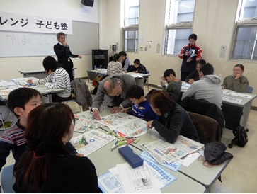 当日は、風が強く冷え込む中、11組25人の親子が参加してくれました。仙販石母田さんによる紙面を使った文字探しやスクラップ作り、河北新報ワークシートなどを使ったゲームなどを楽しんだ後、小関さんの新聞コラムの書き写しと要約ついて。最後に朝日新聞の見留所長と田刈子担当による新聞活用と勉強法を体験談も交えてのお話をしました。