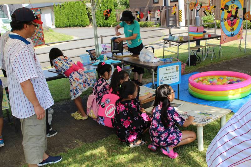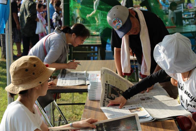 お祭り当日は猛暑となりましたが、沢山のお客様にお越しいただきました。暑さに負けず、真剣に新聞を見つめるお子様方のまなざしが印象的でした。来年も機会があれば、楽しい企画を考えて参加したいと思います。